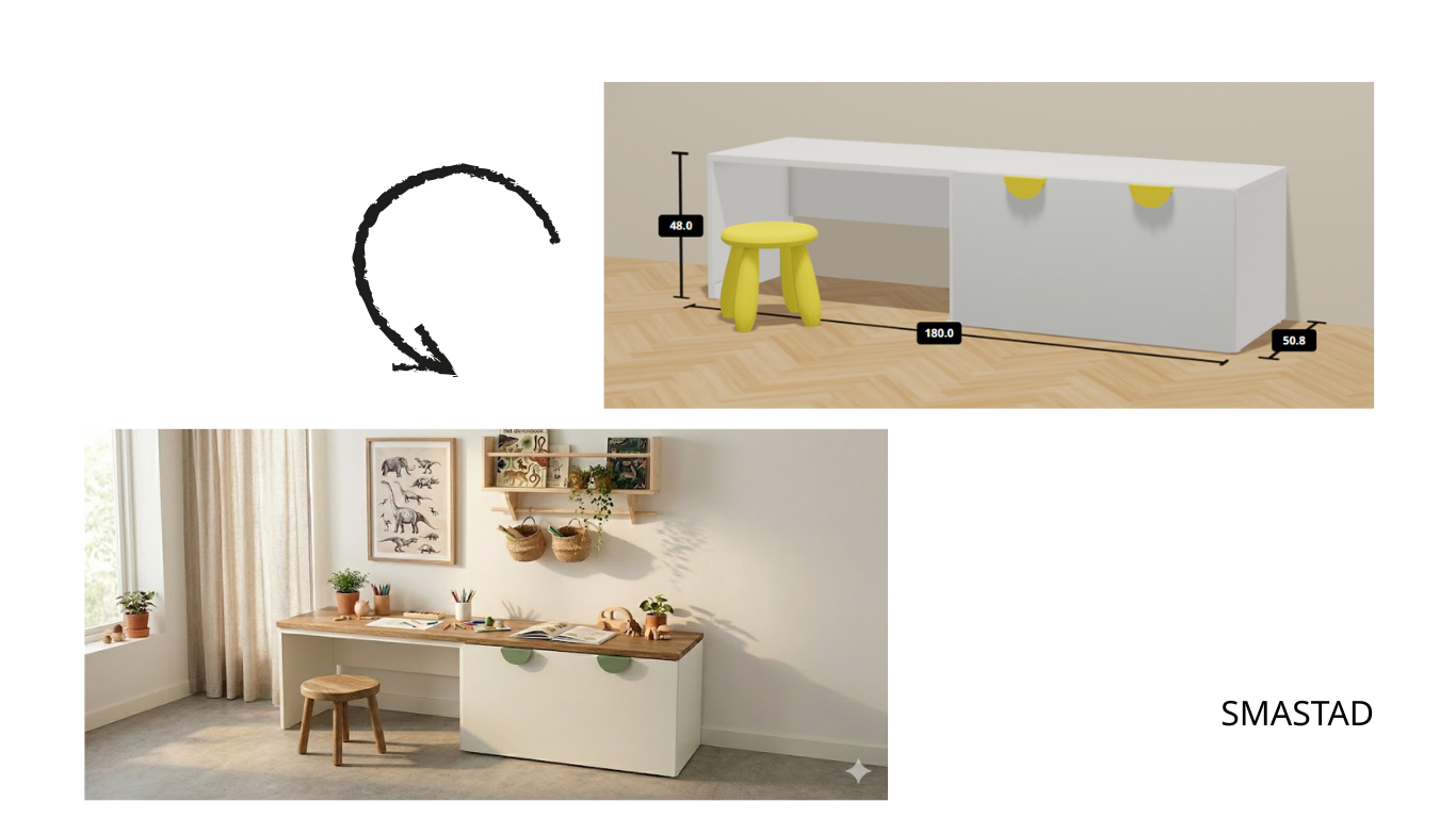 מחפשים שולחן יצירה שהוא גם מקום לאחסן את כל הטושים, הדפים והמשחקים? פשוט מחברים שתי יחידות אחסון של SMASTAD (כמו בתכנון המצורף), מניחים מעליהן פלטת עץ פשוטה, מוסיפים שרפרף קטן, ויש לכם עמדה מושלמת, נמוכה ונגישה לילדים!